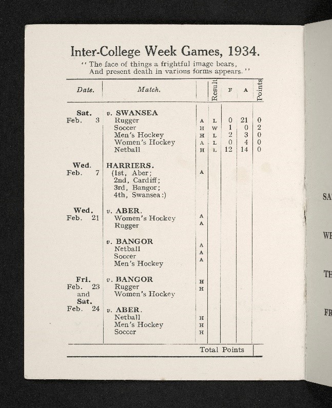 Mae gennym bedair rhaglen Wythnos Ryng-golegol a oedd gynt yn eiddo i Iorweth John, o bob un o’i flynyddoedd yn fyfyriwr. Mae’n rhaid bod y digwyddiad chwaraeon blynyddol hwn rhwng colegau cyfansoddol Prifysgol Cymru wedi bod yn rhan sylweddol o’i brofiad yn fyfyriwr, gan fod pobl eraill oedd yn bresennol wedi’u harwyddo a’i fod wedi’u cadw’n gofroddion.