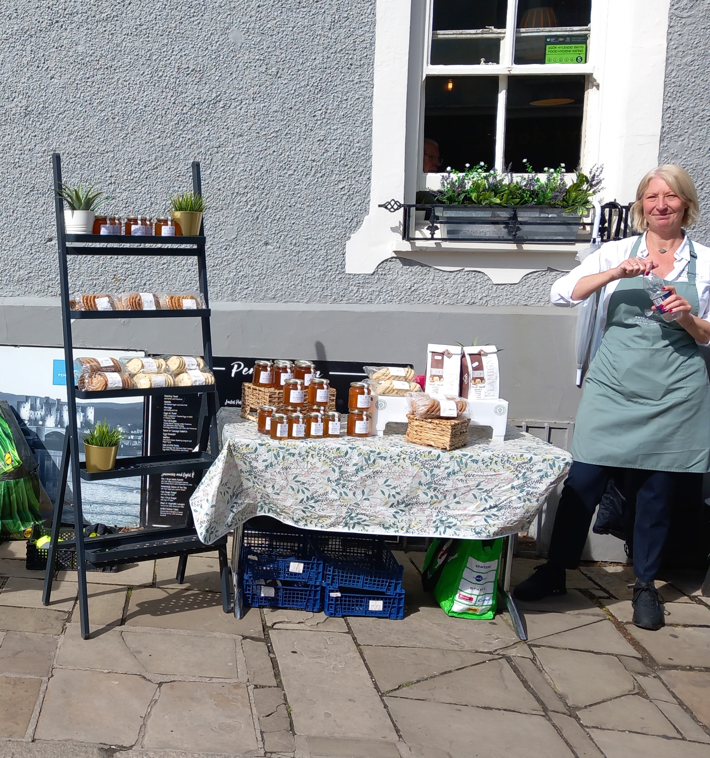 A vendor at the Conwy Honey Fair stands at a market stall filled with jars of honey, baked goods, and other products, with a decorative tablecloth and potted plants, in front of a grey building.