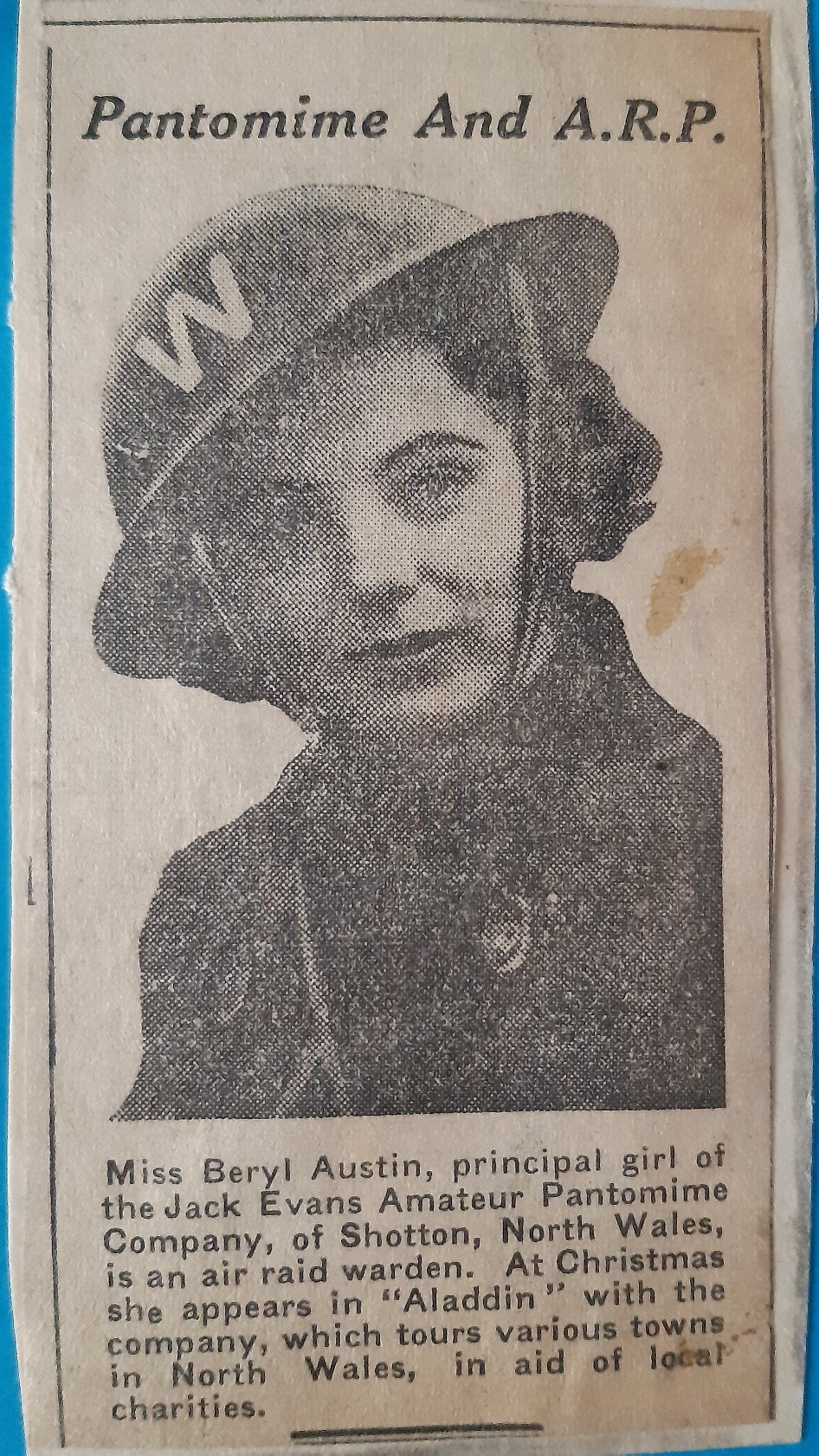 We have recently been fortunate enough to receive records of the Jack Evans Amateur Pantomime Company on loan from Mr Colin Baines, nephew of Jack Evans. Over the years, he has put together a detailed history of the Company and his family’s involvement in it, creating a wonderfully rich archive. It includes original scripts, production photographs, newscuttings, advertisements and historical memorabilia of this dynamic local theatre company which was in operation between 1929 and 1942. The Company performed extensively in the North-East Wales area, spanning Connah’s Quay, Shotton, Mold, Holywell, Bagillt, Prestatyn and Rhyl.