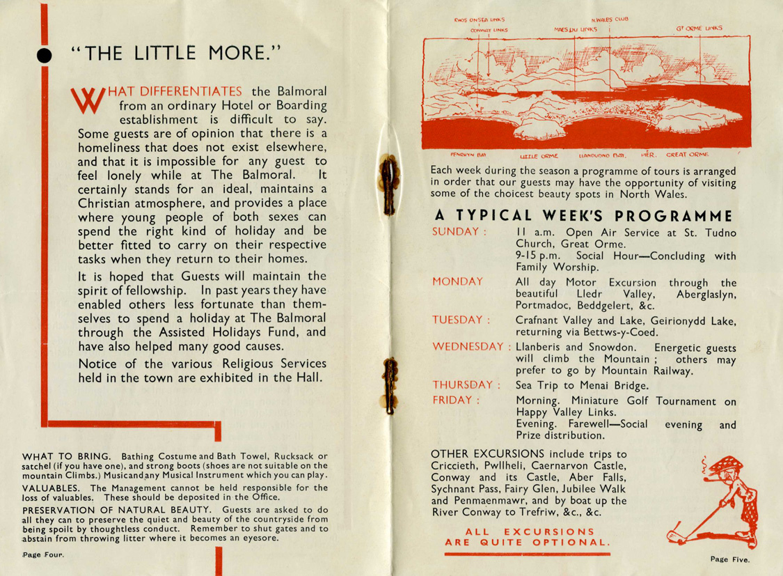Heading north, we reach Llandudno and check into the Balmoral Hotel. Nowadays, the building houses holiday apartments, but in the 1930s, the hotel’s brochure suggests they catered to a young, “well-behaved” crowd. The brochure outlines a typical week’s events: an open-air church service on Sunday, a mini golf tournament on Friday. It paints a picture of a quite structured getaway, quite different from the more spontaneous trips common today.